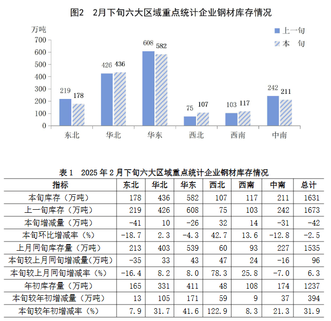 2025年2月下旬,重點(diǎn)統(tǒng)計(jì)鋼鐵企業(yè)(以下簡稱“重點(diǎn)企業(yè)”)鋼材庫存量1631萬噸,環(huán)比上一旬減少42萬噸,下降2.5%;比年初增加394萬噸,增長31.9%;比上月同旬增加96萬噸,增長6.3%;比去年同旬減少171萬噸,下降9.5%,比前年同旬減少111萬噸,下降6.4%(見圖1)。