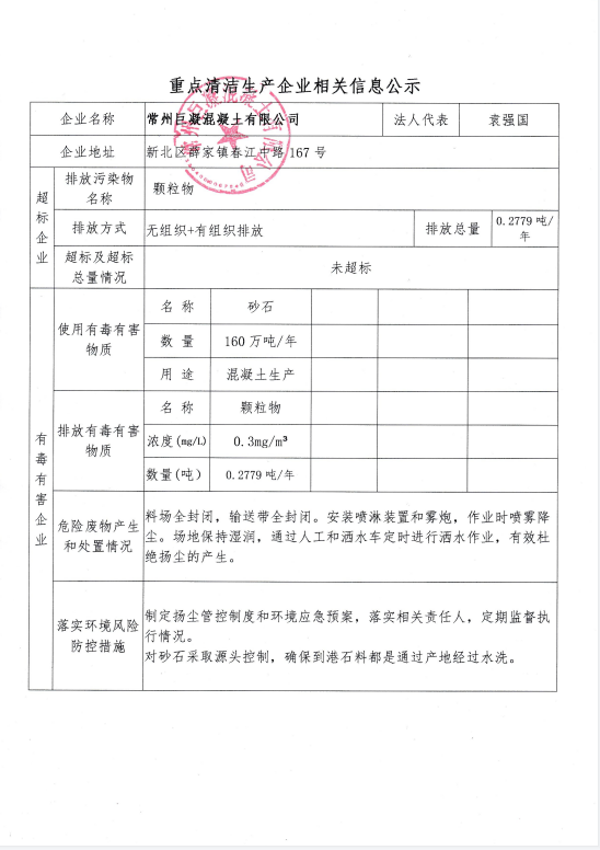 巨凝混凝土清潔生產信息公示